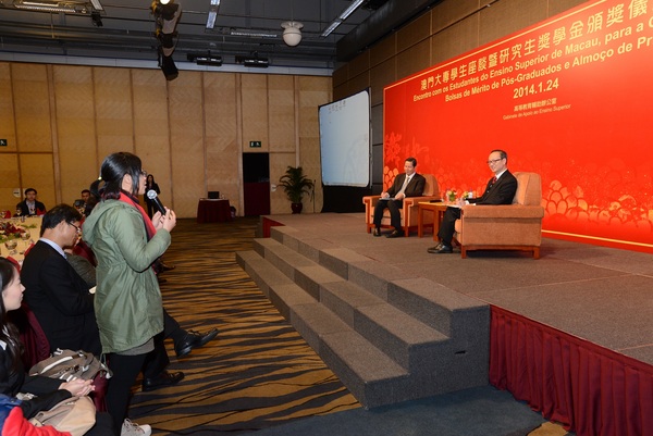 高等教育辅助办公室日前举办澳门大专学生座谈暨研究生奖学金颁奖仪式及迎春午宴,社会文化司张裕司长应邀出席,向学生表达关心和致以节日问候,并聆听学生的意见和建议。 出席是次活动的包括2013/2014学年研究生奖学金获奖者,来自内地、香港、台湾、澳洲和本澳26所高校澳门学生会代表,澳门大专学生部落会员,以及曾参与去年高教办外访交流活动的学生等150馀人。会上,与会学生踊跃发言,分别就人才培养、吸引人才回流、专业实习、专业认证、学习交流、就业、个人发展等提出多项意见和建议。 张裕表示,构建本地人才培养的长效机制是政府施政的重中之重,勉励学生重视及提升实践能力和领袖能力,不断持续进修,提升竞争力,创造精彩人生。他又表示,很高兴能与同学们交流,乐见他们就政府的政策提出各自看法和建议,政府会持续完善相关工作,制订更具成效的政策。 此外,研究生资助发放技术委员会举行2013/2014学年研究生奖学金颁奖仪式,向获得硕士奖学金、硕博连读的博士奖学金、博士奖学金的学生颁发证书。张裕勉励获奖学生继续努力,追求更高层次的知识殿堂,并强调政府未来会不断优化机制,创设条件,支持更多居民接受高等教育,促进居民向上流动。 出席是次活动的还包括社会文化司司长办公室张素梅主任、高等教育辅助办公室苏朝晖主任和何丝雅副主任,以及研究生资助发放技术委员会李沛霖委员和何桂铃委员等。