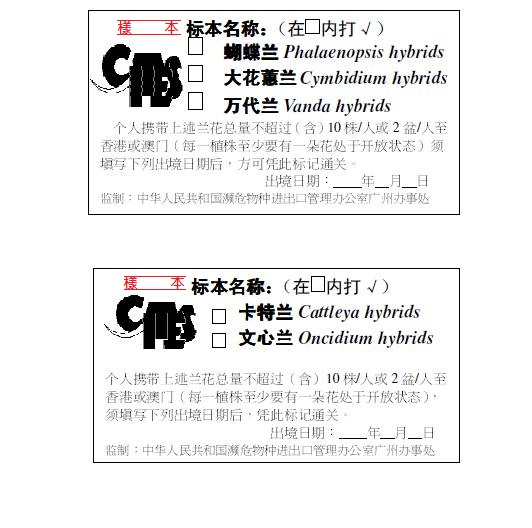 根据内地有关规定,个人从广东省携带不超过两盆或十株人工培植蘭花(即蝴蝶蘭、大花蕙蘭、万代蘭、文心蘭及卡特蘭)直接出境到港澳,须出示合格之标签。