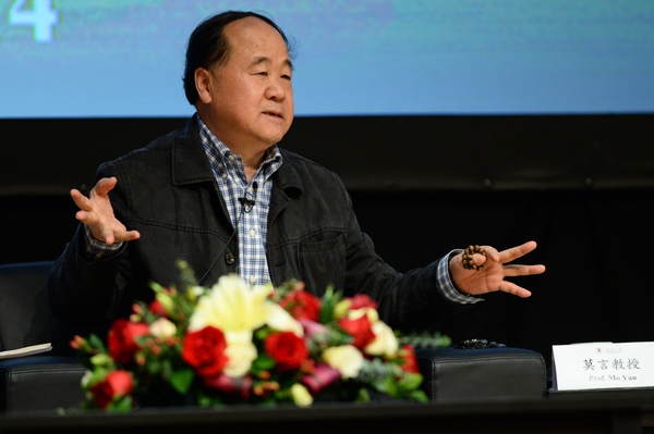 澳门大学荣誉博士、中国首位诺贝尔文学奖得主莫言应澳门大学邀请,於今(7)日在该校大学会堂以"汉语文学的成就与前途"为题开设文学讲坛,并与特邀嘉宾澳门基金会行政委员会主席吴志良博士以及澳大讲座教授杨义进行了一场高水平的学术对话,为全场观众带来一场极富啓发性的文学盛宴。