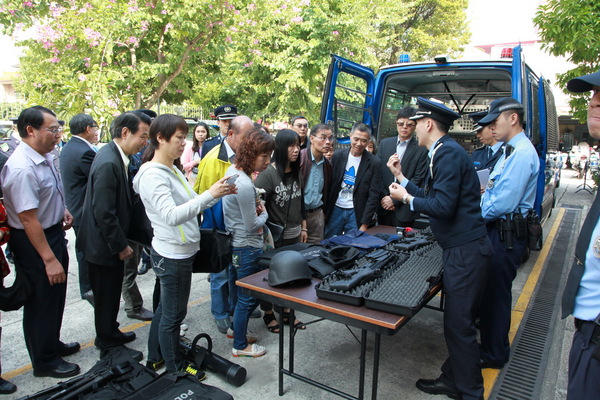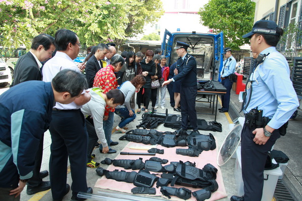 治安警察局今天上午举办"社区警务交流会",来自三个社区团体(街坊会联合总会、物业管理业商会、民众建澳联盟)的主要负责人吴小丽、崔铭文及陈德胜及社区警务主任共三十多人,午前扺达交通厅,局长马耀权、副局长黎锦权,以及警务单位多位主管热情接待。 局长马耀权致词时表示,今年在社区主任、街坊市民的通知或协助下,治安警破获多宗潜藏在社区的违法犯罪行为,包括涉及爆格、贩毒、非法按摩场所等案件。而目前己届今年第四季度,是一个非常重要的工作阶段,一方面有回归十五周年庆祝活动,另一方面各个节假日亦接踵而来,会有大量旅客来澳,希望社区主任多加留意身边的治安状况,遇有异常情况立即联系本局,共同确保此阶段各项工作顺利进行。 活动接着由警务厅及交通厅的代表就本年的整体治安形势进行工作简报,透过统计数字介绍治安以及交通状况,提醒社区主任第四季度应防范的事项,亦播放了内部士气宣传片予嘉宾欣赏;其后社区主任参观了交通厅的装备器材,以及今年最新推出的特别巡逻组车辆及精良装备。交通管理工作与市民生活息息相关,而今年新成立的特别巡逻组更是市民安全所赖,当中展示的各种新式防护装备和武器吸引了嘉宾的视线,社区主任们展现出极大的兴趣,赞叹之馀纷纷发问,拍照留念或亲身试用警备,互动气氛热烈。 社区警务联络机制是恒常持久的警民合作,面对新一阶段的工作,治安警察局会继续与社团警务主任一起,保持紧密联系,为预防和打击犯罪,为缔造安全和谐的家园而携手并进!