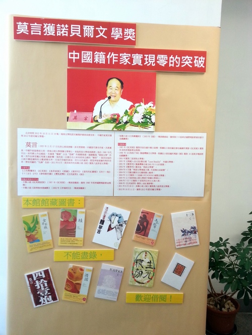 自作家莫言荣获本届诺贝尔文学奖后,文化局澳门中央图书馆辖下各馆所藏的莫言着作借阅量激增,对促进阅读起了良好效应。 澳门中央图书馆早前注意到读者的阅读需求,特於本年初搜购了莫言的着作,同时添置了较多复本,分发到辖下各馆供读者借阅,当中大部份图书现已上架。莫言以写作小说作品见称,根据馆方的统计,其小说作品《蛙》、《丰乳肥臀》、《红高梁》、《檀香刑》、《生死疲劳》及《酒国》等借阅量较高,其他作品如《我的高密》、《莫言散文新编》等亦深受读者欢迎。 为让读者了解馆藏及便利借阅,中央图书馆总馆及辖下的何东图书馆、青洲图书馆、望厦图书馆、红街市图书馆、路环图书馆及流动图书车特於馆内设置有关莫言着作的简介壁报,供读者参阅;同时,馆方正自各区书库中抽调较早期版本的莫言着作到各馆上架,以尽量满足读者的借阅需求。