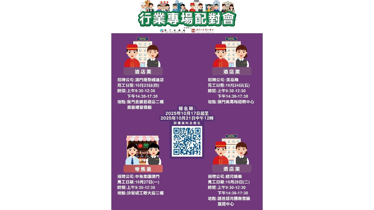 2025年10月16日 10:48為協助有求職需求的澳門居民盡快就業,以及為緩解業界的人資需求壓力,勞工事務局(下稱勞工局)與澳門工會聯合總會(下稱工聯)合作於10月續辦四場行業專場配對會,合共…