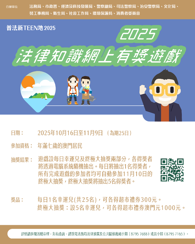 2025年10月16日 10:43為推廣青少年法治教育,法務局與市政署、經濟及科技發展局、警察總局、司法警察局、治安警察局、文化局、勞工事務局、衛生局、社會工作局、環境保護局及消費者委員會共12…