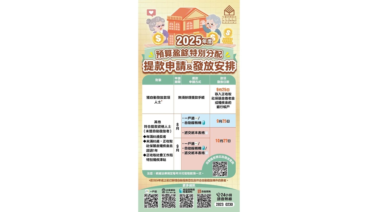 2025年9月25日 18:30首批獲批提取非強制性中央公積金制度2025年度預算盈餘特別分配款項的人士於今(25)日收到有關款項。 已辦理自動提款登記且符合自動發放條件的長者,及於8月內透過…