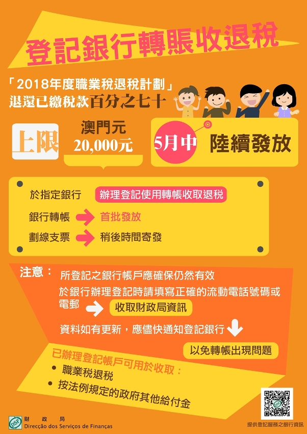 「2018年度職業稅退稅計劃」款項將於5月中陸續退予符合資格職業稅納稅人,首批先向已於指定銀行辦理登記使用轉帳收取退稅的納稅人,退還已繳稅款百分之七十,上限為澳門元20,000元。未辦理登記者,退稅款項會於稍後時間以郵寄劃線支票或結算單退回。
