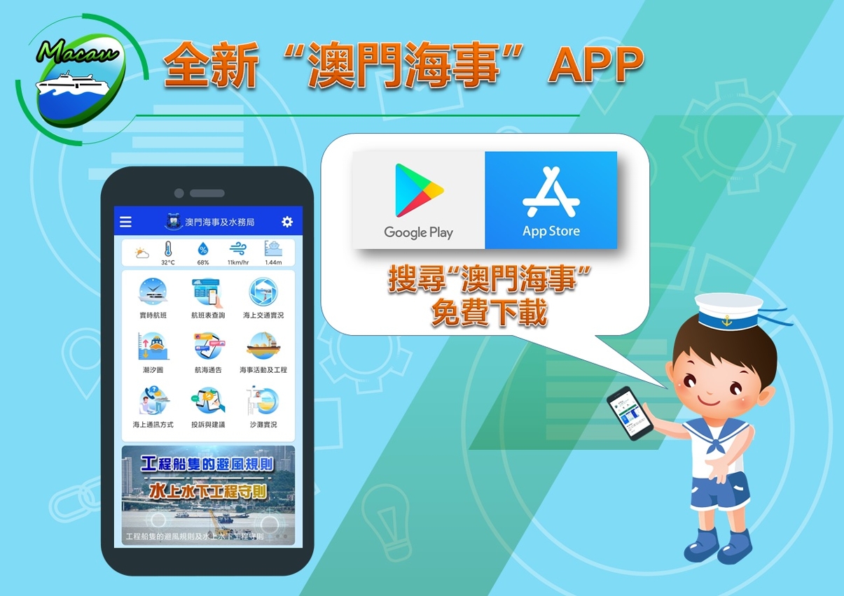 為響應7月18日海事及水務局日,局方已推出全新的“澳門海事”手機應用程式,把海上航班、海灘情況、海上交通等實時資訊整合於一個應用程式當中,讓市民、旅客、海事業界透過智能電話就能夠一手掌握實時海事資訊。