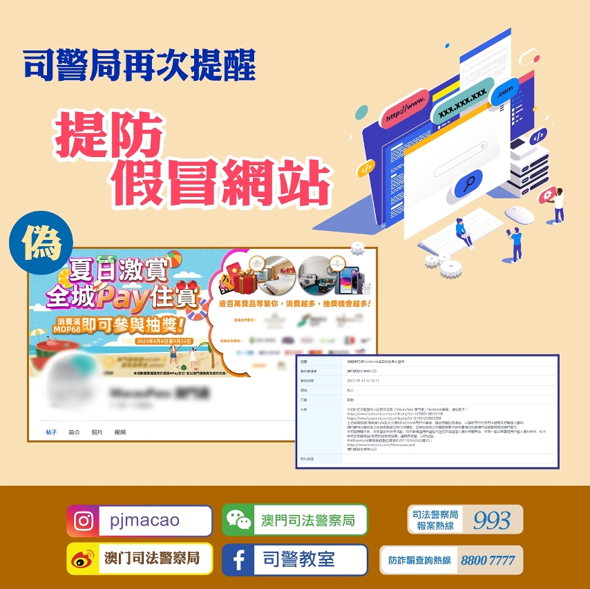 司法警察局發現近日有騙徒在網上社交平台開設假冒本澳某大型電子支付平台專頁,相關假冒專頁之頁面與官方專頁極為相似,且懷疑上述假冒專頁曾以私訊方式隨機向大量社交平台用戶發送中獎訊息,並要求用戶透過詐騙訊息中附帶之釣魚連結進行登記,藉此騙取用戶的信用卡號碼及相關個人資料。