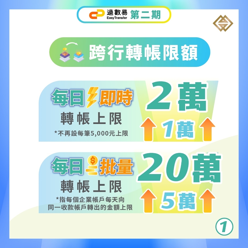 澳門元即時跨行轉帳限額由原本每天10,000元提升至20,000元,且取消每筆交易上限5,000元的限制。批量轉帳每日上限由50,000元提升至200,000元。港元跨行轉帳的金額上限、登記方式以及轉帳操作,均與澳門元相同,只需於手機銀行或第三方支付機構的APP內選擇“過數易”,按指示填妥資料便完成開通服務,並可即時使用。