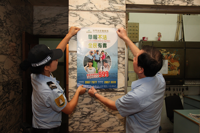 近年本澳商業活動愈見頻繁,商業樓宇亦較以往更有可能成為盜賊光顧的對象,本局對民居與商廈的安全同樣予以高度重視。今日上午,治安警察局公關處副警司黃超文率社區宣傳隊到新口岸一帶進行滅罪宣傳,目的在第四季加強包括商業大廈在內的管理員的防罪意識,做好相關預防工作。 社區警務的實踐必須建立在長期的警民接觸,以共同保障治安環境;是日宣傳小隊分成兩個小組,分別到區內共三十幢大廈及商廈進行接觸,向大廈管理員傳遞防罪滅罪訊息,派發海報、小冊子及管理員須知等,傳遞本局對該區治安的關注,鼓勵警民合作。 管理員是大廈安全的第一防線,警方希望他們做好訪客管理、內部監察的工作;鄰里或商戶之間應守望相助,注意區內治安形勢;主動提供潛在犯罪訊息,例如懷疑盜竊犯罪、非法旅館、不法場所等,應盡快聯繫警方,以便及時部署打擊;過程中亦即時進行問卷調查,收集警情和聽取治安訴求。 市民和管理員的支持確令警方防打犯罪事半功倍,本局會持續在各類大廈防罪工作進行多元的宣教活動,冀加強與市民的溝通互動,使社區聯防網絡更加穩固。