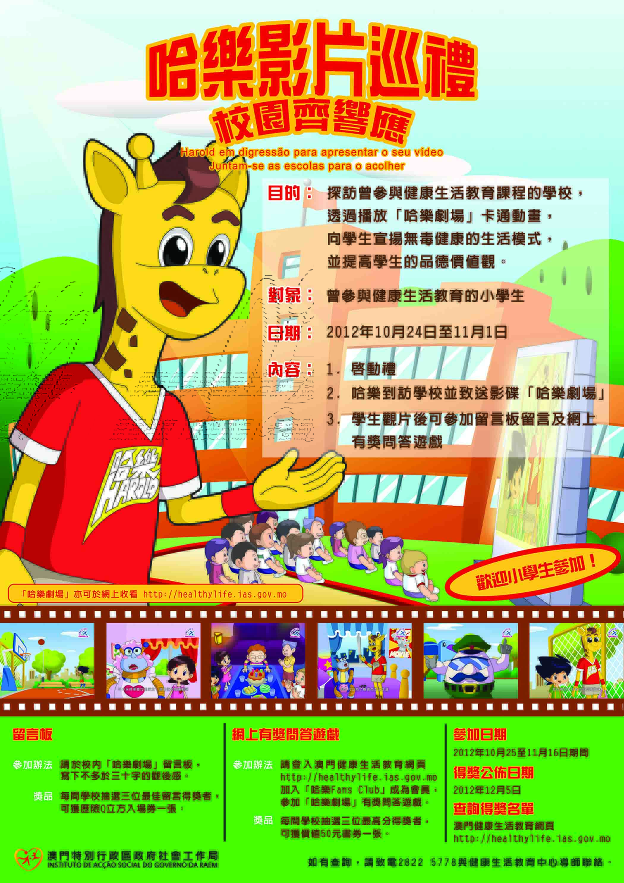 為了提升本澳學生預防濫藥的意識,社會工作局製作了禁毒宣傳短片集「哈樂劇場」,並將向全澳65間學校致送影碟,進一步推廣預防濫藥的訊息。 社會工作局轄下健康教育中心以中心的吉祥物—長頸鹿"哈樂"為主角,製作了一套禁毒宣傳短片集「哈樂劇場」,並將於本月24日至下月1日期間舉辦《哈樂影片巡禮、校園齊響應》活動,期間將會探訪全澳65間曾參與本局健康生活教育課程的學校,並向校方致送禁毒宣傳短片集。短片透過卡通動畫的形式及輕鬆的手法,向學生宣揚無毒和健康的生活模式,提高學生的品德價值觀。 活動期間,健康生活教育中心人員將會帶同"哈樂"到訪學校,向學生派發精美的哈樂書籤。自2004年至2010年期間,本局曾六次巡迴探訪本澳學校,反應熱烈及效果理想。如有查詢,可瀏覽社會工作局網頁www.ias.gov.mo。