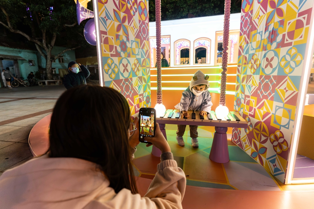 氹仔區 - 嘉模墟的“奇幻遊樂屋”:踏上“奇幻遊樂屋”內的光影飛行棋,期待飛往更遠的地方。靠近新月燈光裝置,感測器會觸發“雨燈”移動。