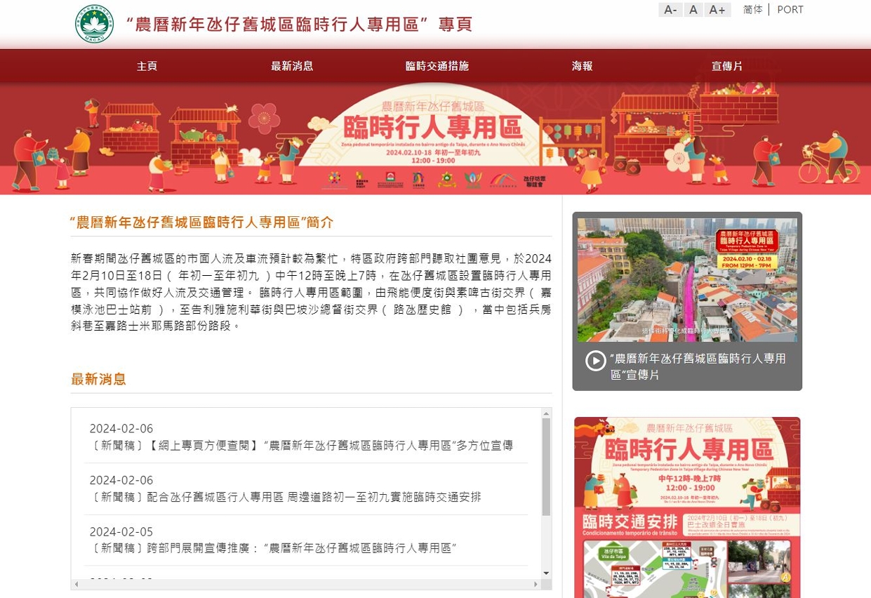 “農曆新年氹仔舊城區臨時行人專用區”各項籌備工作已準備就緒,政府跨部門與氹仔舊城區的社團、商會及商戶,一直保持緊密溝通,共同落實好這項措施,確保農曆新年該區人流及交通有序通行,營造舒適安全的步行環境。