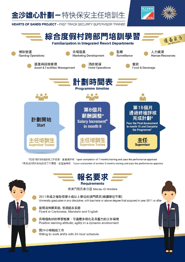 為支持本地人才全面發展,拓展多元職涯路向,勞工事務局和金沙中國有限公司(下稱“金沙中國")合作推出「金沙雄心計劃—特快保安主任培訓生」,以“先入職、後培訓”方式,為有志投身綜合旅遊休閒服務行業的澳門居民提供全方位培訓及事業發展機會,計劃由5月21日起接受申請。