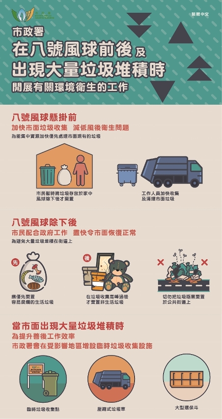 為提高居民及商戶正確處理垃圾,以及及時處理招牌廣告,市政署多年來持續推廣相關訊息,並於風季期間加強宣傳,透過多種媒介播放相關宣傳片及聲帶、在各區張貼海報,以及在公共交通工具投放廣告等。如欲了解相關資訊,可瀏覽市政署環境資訊網https://www.iam.gov.mo/macaohygiene。