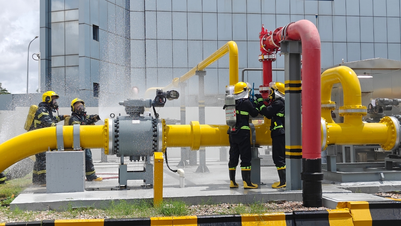 演習模擬天然氣接收站工作人員在進行供氣設備防腐打磨作業期間,設備閥門法蘭連接處突然有大量天然氣泄漏,打磨作業產生的火花引發泄漏點及周邊區域起火,工作人員發現事故後隨即按照內部應急計劃,採取安全措施及疏散相關人員,同時致電消防局求助,事故中有1名員工被火焰灼傷。