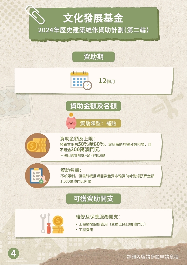 此外,文化發展基金於9月24日至11月22日接受今年第二輪“歷史建築維修資助計劃”的申請,支持業權人定期對私人文物建築和具文化價值建築開展結構檢查或檢測、實施外觀保養,以及因應檢測結果實施必要的修復及維護等工作。資助範圍包括在申請期開始前尚未開展維修工程的被評定、待評定的不動產及具文化價值的不動產,並須由不動產的業權人或獲授權人提交申請。資助計劃為補貼形式,資助金額為預算支出的50%至80%,上限200萬澳門元,資助期12個月,資助計劃總預算金額1,000萬澳門元。