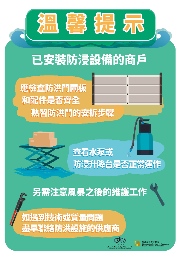 已安裝防浸設備的商戶,應檢查防洪門閘板和配件是否齊全,熟習防洪門的安拆步驟;已安裝防浸升降台和水泵的商戶,應檢查設備是否正常運作。如有疑問,應盡快向所屬的工程公司或供應商了解,做好準備,以策萬全。