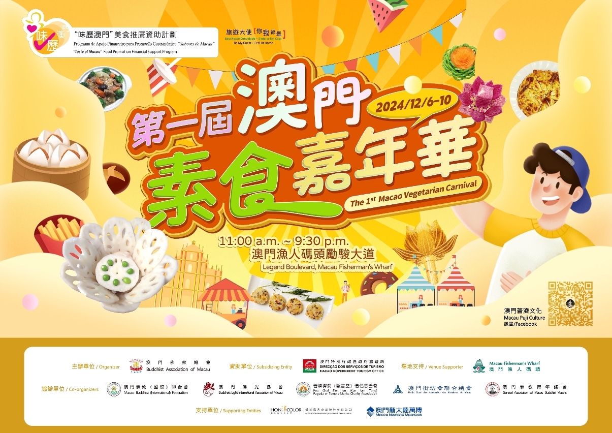 擁有多元文化共融特質的澳門於12月6日至10日在漁人碼頭勵駿大道迎來“第一屆澳門素食嘉年華”。活動以多元文化、多元風味及多元體驗3個亮點呈獻60個素食及文創攤位,5天的活動亦包括文藝演出、文化講座、展銷活動、遊戲攤位、打卡裝置及頌澳門慶回歸傳燈儀式。