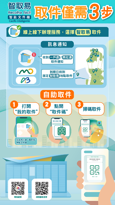 現階段,“智取易”適用於身份證明局所有身份證明範疇的證明書;法務局經櫃枱申請的登記證明,以及經“一戶通”線上申請的汽車、民事登記證明;市政署多種牌照准照、行政許可和食品場所登記服務等,涵蓋居民、企業和社團常用的線上線下服務事項。未來,特區政府將有序擴展“智取易”的適用範圍,逐步納入不同部門的申請項目,推動更多服務實現“高效辦理,便捷取件”。