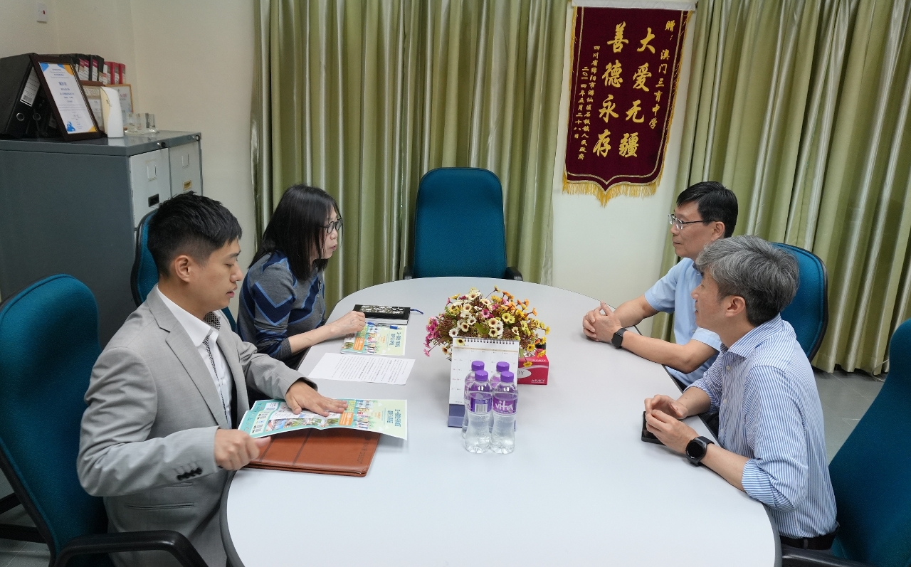 此外,經科局代表亦先後拜訪了澳門三育中學、氹仔中葡學校及氹仔坊眾學校幼稚園。與學校負責人就行人專用區設置期間公交改道、臨時巴士站設置、對學校上下課時段的交通疏導及師生出行安全等內容進行交流及討論。