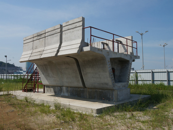輕軌工程已進入大規模施工階段,各路段的施工單位正全力展開地基及高架橋墩的建設;施工單位亦於日前試作高架橋預製件的樣板,以確保隨後開展批量生產的預製件之規格及質量達標,並滿足系統設置的嚴格要求。 輕軌高架橋主要以預製件方式建造,氹仔段的高架橋面由超過2700件預製件吊裝組合而成。運輸基建辦公室在確保輕軌建設質量的大前提下,除選用耐久性較高、設計壽命達到100年的混凝土作為主要硬體建築之建材外,亦要求各施工單位在預製件批量生產前,先行按各路段的設計試作三組不同的高架橋預製件樣板,分別為:輕軌氹仔段最常見的直線雙向橋面、路氹城段的轉彎雙向橋面以及連接輕軌車廠的直線單向橋面。 各施工單位可透過高架橋預製件的試作,在批量生產前更好地掌握各項生產流程。而試作完成的預製件樣板除會進行尺寸規格等檢查,確保符合標準外,另一重要作用是作為測試平台,讓行車物料及系統供應商於預製件上開展土建工程與系統的協調工作,確保兩者後續的工作能夠相互配合及順利開展。供應商會陸續按實際規格於預製件橋面建造行車基座,並安裝導軌、供電軌及信號纜線等各項重要系統裝置,當中的施工技術水平要求較高,除行車基座的路面須保持平滑,導軌、供電軌等裝置在安裝後亦須作精確的調試及測量,方可確保列車未來的暢順運作。 各施工單位在完成高架橋預製件的生產準備工作後,今年內會陸續展開批量生產,運建辦會持續透過工程監理顧問及質量監控單位等進行嚴格把關,確保輕軌高架橋的建設質量達至國際水平。
