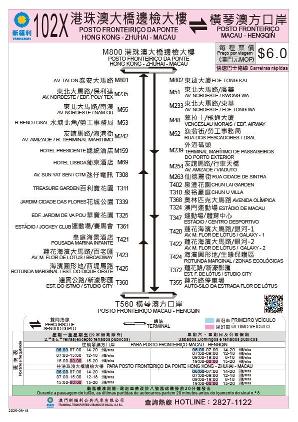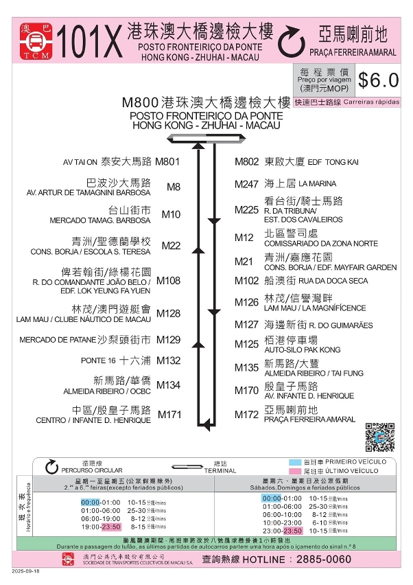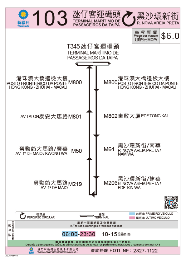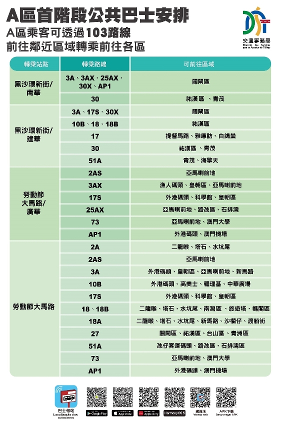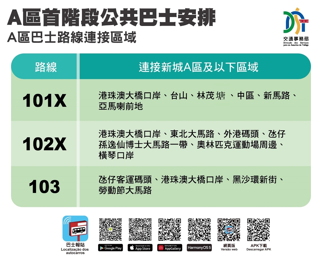 巴士服務方面,位於新城A區公共房屋附近的“泰安大馬路”站及“東啟大廈”巴士站亦會於經濟房屋辦理上樓手續的同一日(即9月18日)首班車起啟用,而101X、102X及103(原103X)巴士路線將新增停靠上述站點;當中,101X行程途經台山、新馬路及亞馬喇前地等;102X行程途經東北區、路氹和橫琴口岸等;103行程則由現時連接氹仔客運碼頭至港珠澳大橋口岸,延伸至A區及黑沙環新街一帶,透過上述路線便利前往澳門半島、氹仔、橫琴口岸等,市民亦可透過上述路線的沿途站點轉乘巴士前往其他區域(詳見附圖3至5,路線指南)。103(原103X)同時調整為一般路線票價,即澳門元3元,現金支付則為6元。此外,局方制作A區公共巴士路線的乘搭和鄰近區域的轉乘建議,供市民參考(詳見附圖6及7),市民亦可透過巴士報站APP的“點對點”查詢,獲取往返A區和目的地的具體搭乘方案。