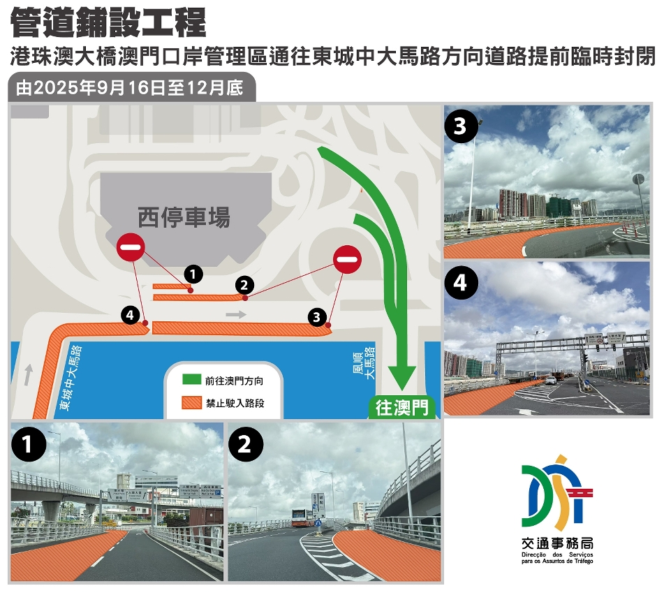 另外,配合區內其它施工中的項目,當日起濠江大馬路將臨時封閉作為工程專用車輛使用;而往來新城A區及港珠澳大橋人工島澳門口岸的一段東城中大馬路,亦於9月16日起臨時封閉自人工島往A區行車方向路段至12月底(詳見附圖8),駕駛者需繞道風順大馬路行駛,局方已在周邊路段提前位置增設臨時指示牌,請駕駛者留意現場交通指示及改道後的行車路線。