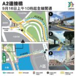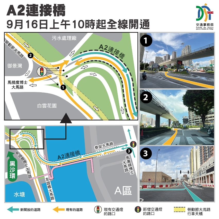 經跨部門協調,為配合未來A區公共房屋的入伙需要,澳門半島連接A區及A區道路將實施新交通安排(詳見附圖1)。於9月16日(周二)上午10時,A2橋正式實施雙向行車以及開通A區的泰安大馬路、部份馬萬祺博士大馬路和鏡海大馬路等多條主幹道;為配合相關路網開通及保障人車過路安全,泰安大馬路沿線增設交通燈。巴士方面,鄰近A區公共房屋的兩個新巴士站將自9月18日首班車起啟用,供3條現有巴士路線101X、102X及103(原103X)停靠;而東創大廈、東啟大廈及東城大廈公共停車場的開放使用詳情,將再對外公佈。