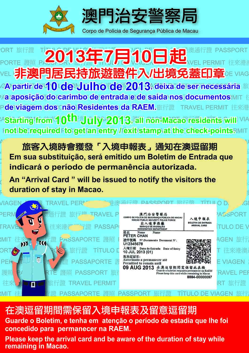 本局將於本年7月10日起全面實施出入境免蓋章措施,所有旅客持旅行證件及護照經本澳各邊境口岸出入境無需蓋章,旅客在准予入境時會獲發一張電腦打印的入境申報表,以取代過往在證件上的蓋章;同樣在出境時亦不會在其證件上蓋章。 上述入境申報表,與現時發給入境澳門的香港永久性居民身份證持有人及內地居民持中華人民共和國往來港澳通行證之措施一樣,入境申請表上載有旅客的姓名、證件號碼、入境日期、批准逗留期限等資料,且設有二維碼的防偽標識,旅客在澳逗留期間應妥善保存入境申報表及留意標示之逗留期限。正常情況下,旅客遺失入境申報表不會影響辦理出境手續。如需補領,亦可親身前往各邊境口岸或氹仔北安碼頭一巷出入境事務廳大樓一樓調查警司處免費辦理。 隨著免蓋章措施全面實施,將有效簡化旅客出入境通關手續,使查驗過程準確快捷,縮短旅客通關時間,有助提升各邊境口岸的通關效率。