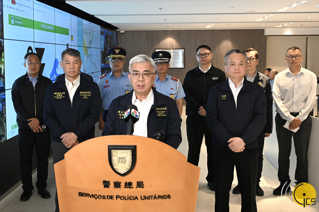 保安司司長、聯合行動指揮官黄少澤在民防行動中心聽取民防架構成員應對熱帶氣旋“麥德姆”的工作匯報,並作出指示。