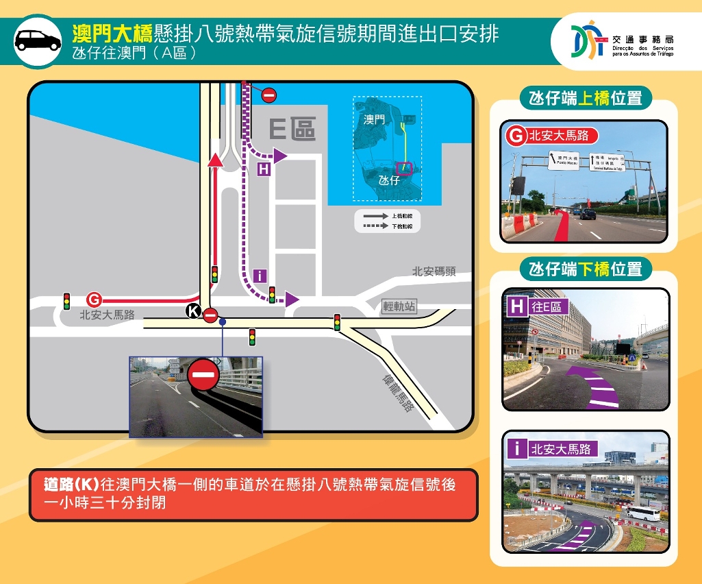 為保障惡劣天氣下市民必要的跨海出行需要,經跨部門協調,特區政府將在8號風球期間,開放澳門大橋供有限度通行(詳情請查閱附表),但如熱帶氣旋的強度、風暴潮水位、降水量及風力等因素構成足以妨害公共安全的風險,民防聯合行動指揮官可隨時禁止輕型客車在澳門大橋通行,敬請市民留意及注意安全。