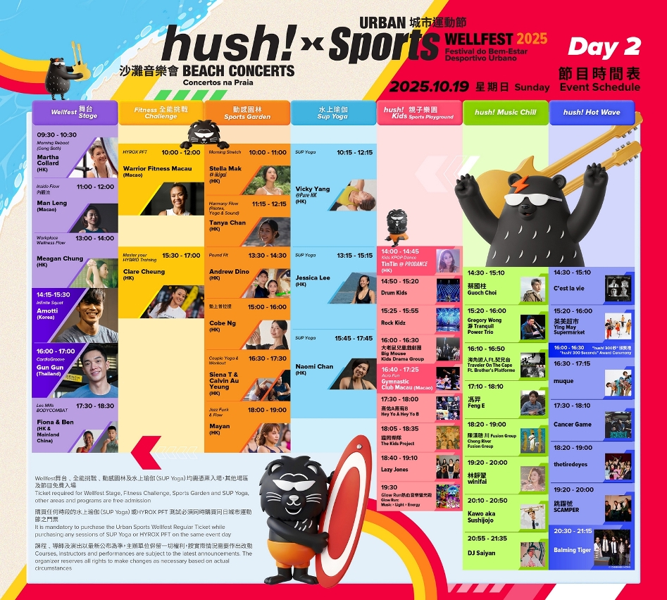 “hush! 沙灘音樂會 x 城市運動節”主活動將於10月18日及19日在黑沙海灘及黑沙臨時休憩空間舉行,設有“Hot Wave”、“Music Chill”、“hush! Kids親子樂園”、“Wellfest舞台”、“動感園林”及“全能挑戰”六大舞台,一連兩日從早到晚帶來馬拉松式的音樂演出和運動課程。現場更設有水上瑜伽、音樂劇親子巡遊、音樂螢光跑、藝術裝置、美食及文創市集、樂器體驗及工作坊等豐富周邊活動,回應市民及旅客的不同喜好和需要,共同感受澳門中西薈萃的文化特色,打造澳門作為中西文明交流互鑒的重要窗口。