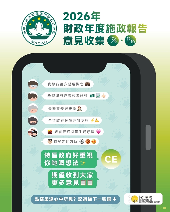 為期一個月的《2026年財政年度施政報告》意見收集工作將於10月17日結束,特區政府呼籲社會各界把握機會積極提出意見和建議。