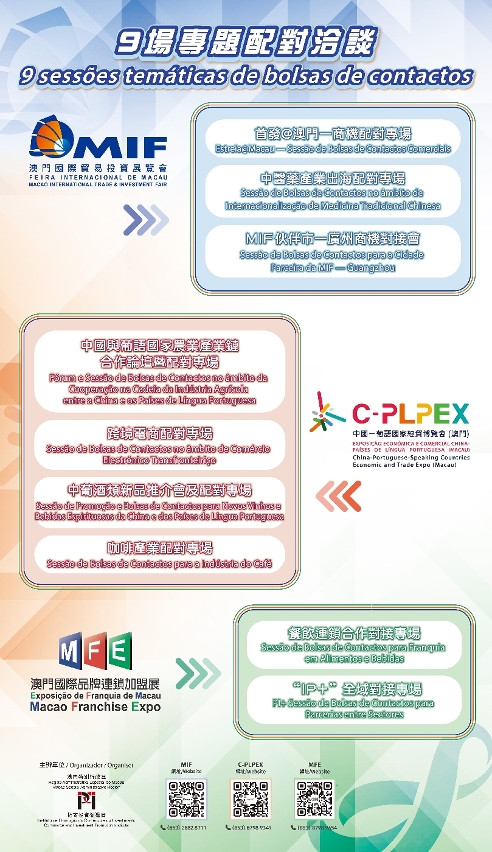 如欲參與三展期間的專題配對洽談等活動,可瀏覽大會網站:www.cplpex.mo、www.mif.com.mo 或 www.mfe.mo;或致電第二屆中葡博覽會專線 (853)2822 8289、第30屆MIF專線(853)2882 8711或2025MFE 專線(853)8798 9654;亦歡迎關注微信號:MICE_IPIM。
