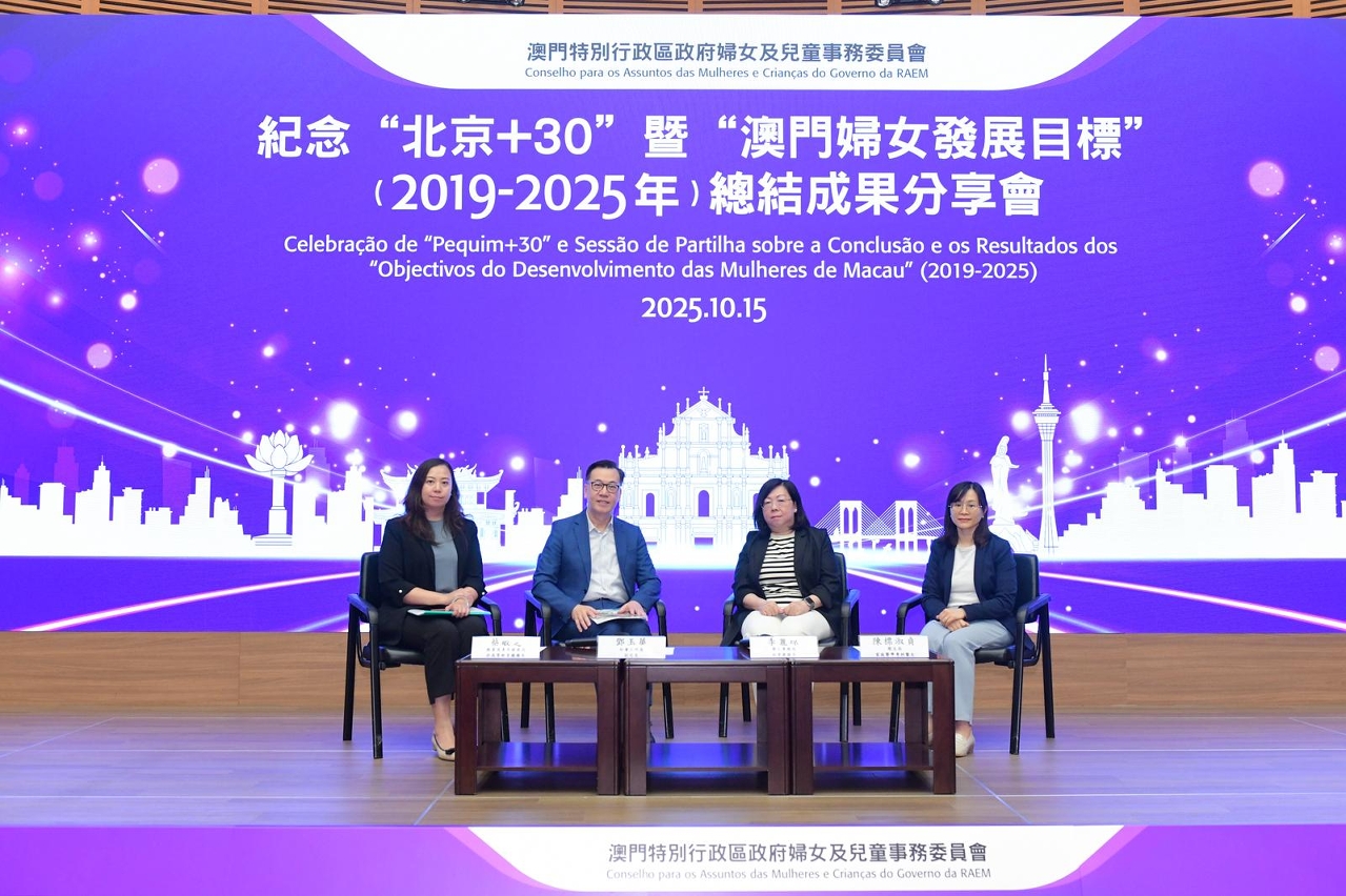 婦女及兒童事務委員會於10月15日下午在澳門科學館會議廳舉行紀念“北京+30”暨“澳門婦女發展目標(2019-2025年)”總結成果分享會,向相關政府部門、民間機構和社會人士分享澳門特區政府首個婦女政策於各領域取得的豐碩成果,並就第二個“澳門婦女發展目標”(2026-2032年)的框架進行引介。包括公共部門代表、婦女及兒童事務委員會委員、民間社團和社會服務機構人員等約120人出席。