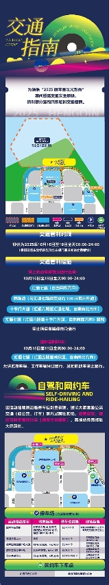 為保障活動道路安全暢通,活動現場周邊路段將實施交通管制。10月16日至10月19日全天00:00-24:00,匯通七路(自西向東方向)、榮珠道(與匯通七路相交處約100米雙向車道)、十字門大道(匯通六路至匯通七路,自南向北方向)、匯通七路(匯通六路至十字門大道,自南向西方向)路段,禁止所有車輛停放及通行。匯通七路(匯通五路至榮珠道,自南向北方向)將於10月16日至10月19日全天00:00-24:00,實行適時管制,僅允許應急車輛、工作車輛憑證通行,其他機動車禁止通行。