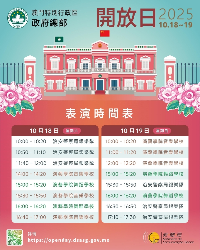 公眾可瀏覽開放日專題網頁 https://openday.dsasg.gov.mo ,了解更多活動詳情,也可透過360度全景拍攝畫面,透過虛擬旅程,從不同角度了解政府總部的面貌。公眾還可下載“澳門特首辦”手機應用程式,閱覽政府總部開放日的相關資訊。
