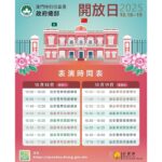 表演節目方面,治安警察局銀樂隊、演藝學院音樂學校和舞蹈學校學生將於兩天開放日的指定時段,為公眾呈獻樂器演奏及舞蹈表演。郵電局繼續在政府總部對面的南灣湖畔設置臨時櫃枱,提供加蓋紀念郵戳的服務,並發售相關郵品。