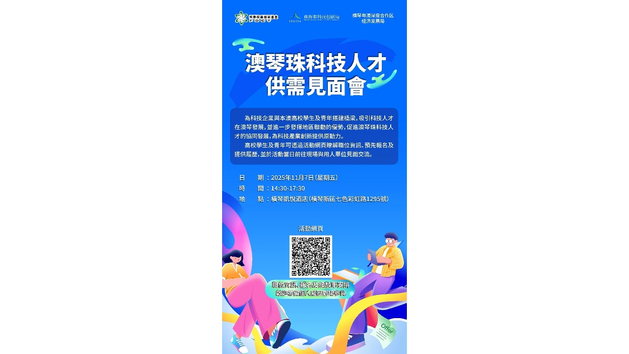 為配合特區政府施政方針,科學技術發展基金(下稱“科技基金”)積極為本澳高校及青年與科技企業搭建橋梁,拓展科技人才的發展空間。為此,科技基金將與珠海市科技創新局及橫琴粵澳深度合作區(下稱“橫琴合作區”)經濟發展局,於2025年11月7日在橫琴凱悅酒店聯合主辦“澳琴珠科技人才供需見面會”,提供148個全職及實習機會。