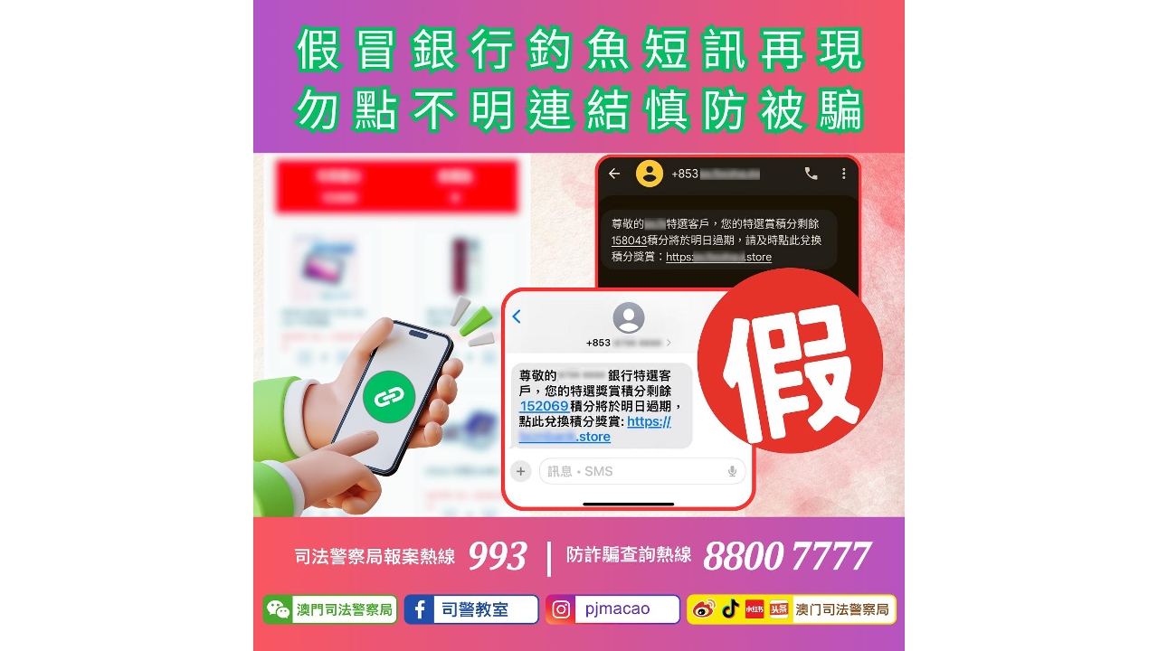 近日,司法警察局發現騙徒再次冒充本澳多家銀行的名義,隨機向市民發送釣魚短訊,以「獎賞積分即將到期」為由,誘使市民點擊短訊內附帶的釣魚連結。由於騙徒的釣魚短訊有可能會混入市民與銀行的真實短訊對話框內,市民務必提高警覺。