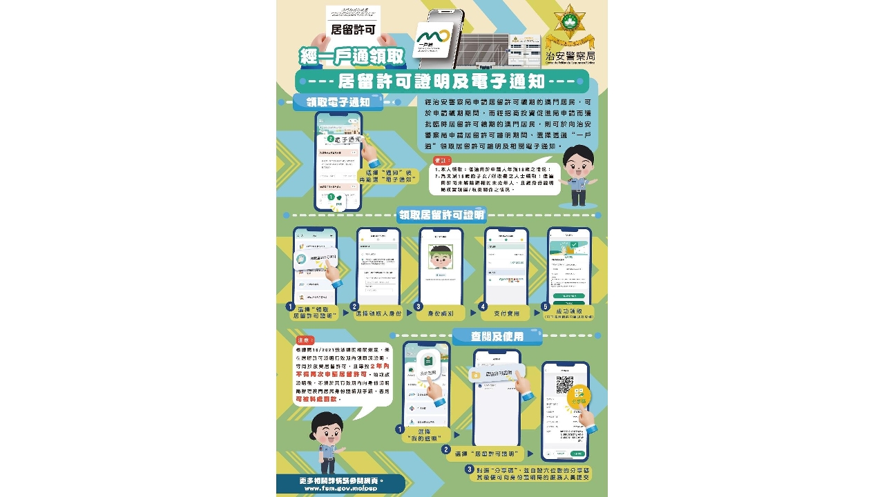 經治安警察局申請居留許可續期的澳門居民,可於申請續期期間,而經招商投資促進局申請而獲批臨時居留許可續期的澳門居民,則可於向治安警察局申請居留許可證明期間,選擇透過“一戶通”領取居留許可證明及相關電子通知。待上述申請獲得批准後,便可以透過“一戶通”領取有關證明及相關通知。倘屬經治安警察局申請續期之個案,該電子通知內容尚包括申請人獲批准居留許可續期的通知。