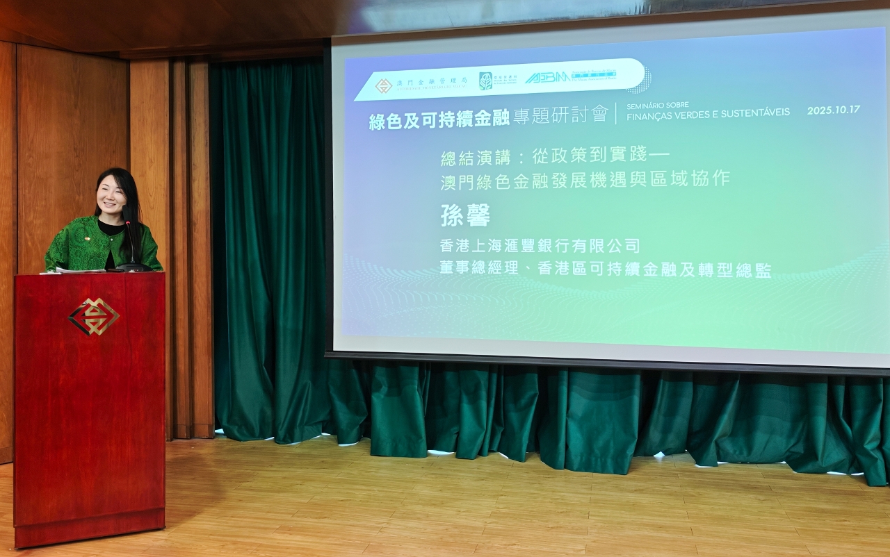 金管局行政管理委員會委員劉杏娟在致辭時表示,自金管局、環保局及銀行公會於五年前簽署《共同推動澳門綠色金融發展》倡議書以來,澳門綠色金融市場已漸趨多元,綠色債券、藍色債券、生物多樣性及碳中和債券等相繼在澳門發行;澳門金融機構亦陸續推出面向本地和區域市場,針對個人、中小企及基建能源等領域的創新金融產品,綠色信貸資產跨境轉讓業務亦相繼落地。金管局正制定氣候風險管理指引,並將展開業界諮詢,以協助本地銀行業應對氣候風險。同時,鼓勵具資質的金融機構和企業,把握澳門的制度與市場優勢,開展多元可持續投融資服務,推動綠色轉型項目與境內外資金有效對接。