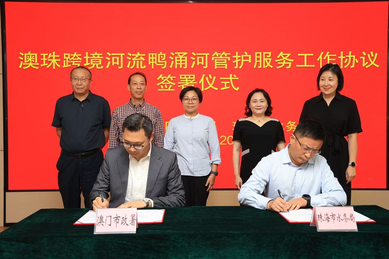 澳門市政署市政管理委員會主席周偉迎一行與珠海市水務局黨組書記、局長許蓓蕾一同考察了鴨涌河的水體及綠化管護情況,並共同簽署《鴨涌河水體、河岸綠化及設施管理協議書》;根據協定,澳門市政署委託珠海市水務局,對鴨涌河的水體治理、河岸綠化養護及沉沙井等設施進行管護,加速“一河兩岸”親水生態景觀長廊建設。另外,在廣東省西江流域管理局、中共珠海市委台港澳工作辦公室、珠海市生態環境局等單位代表的見證下,《鴨涌河跨境河流協同治理工作辦法》亦同步啟動實施。