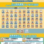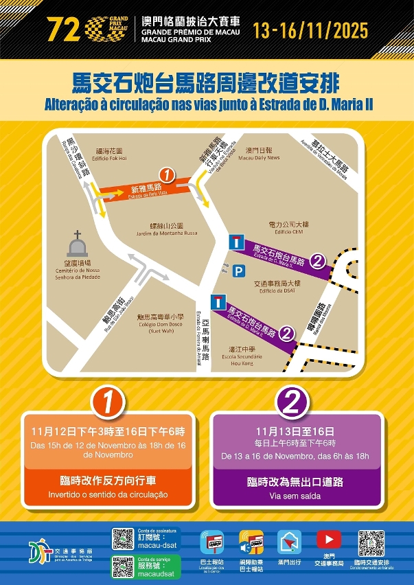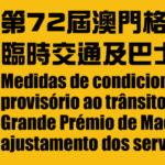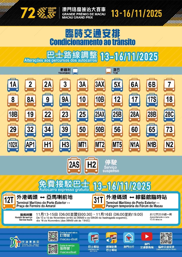 因應體育局舉辦第72屆格蘭披治大賽車,11月12日(周三)至16日(周日),賽道及周邊道路分階段實施多項臨時交通管制措施,11月13日(周四)至16日(周日)期間合共52條巴士路線需作臨時安排,並設兩條免費穿梭巴士路線。為緩解賽道周邊交通壓力,政府多個部門透過協作部署,開通B匝道和調整部份道路工程的施工安排,改善道路通行能力。具體的臨時交通及巴士調整可瀏覽交通事務局專頁(https://www.dsat.gov.mo/dsat/subpage.aspx?a_id=1761559294)。
