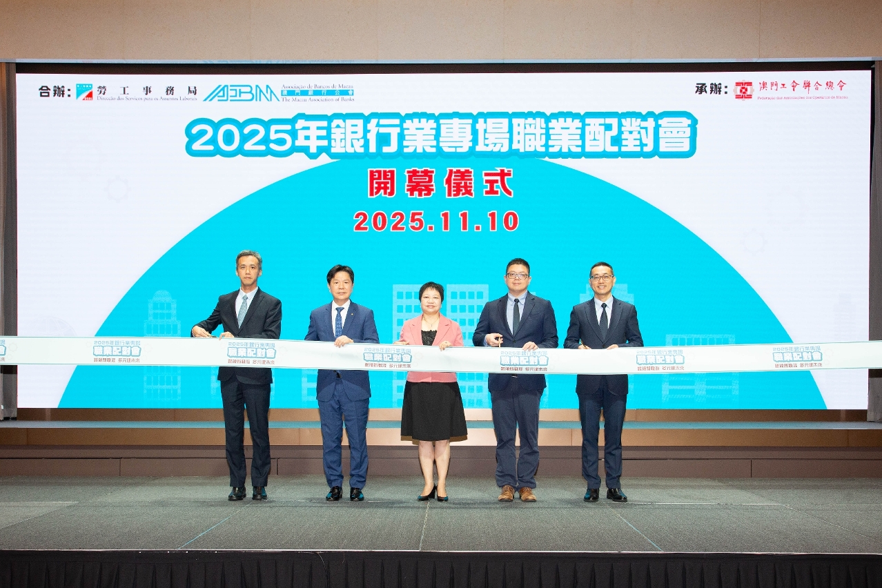 配對會今(10)日早上舉行開幕式,由勞工局副局長陳子慧、副局長陳俊宇、澳門銀行公會主席葉兆佳、澳門銀行公會人才與發展委員會主席陸振剛,以及澳門工會聯合總會副會長李振宇共同主禮。