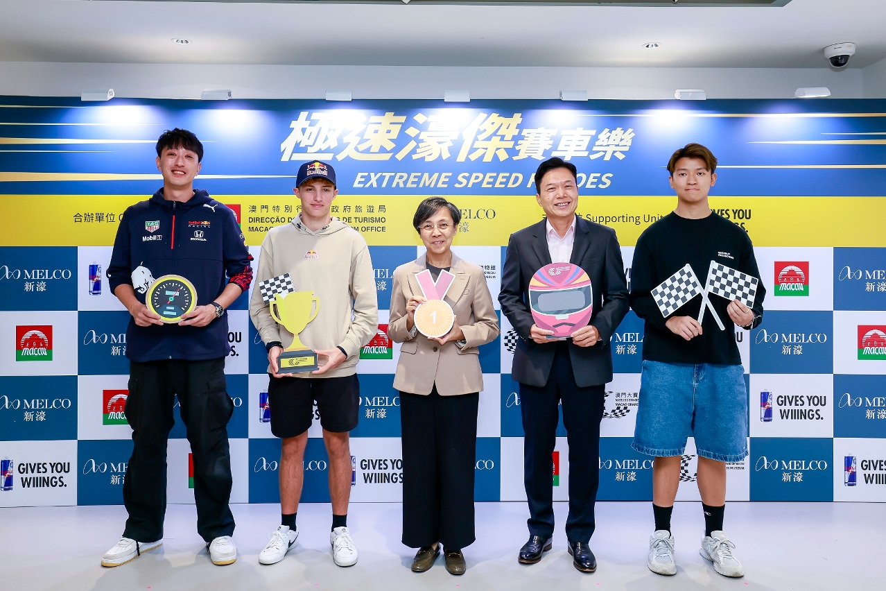 “澳門大賽車博物館X新濠博亞娛樂:‘極速濠傑’賽車樂”啟動禮今(12日)在澳門大賽車博物館舉行。旅遊局局長文綺華、新濠博亞娛樂董事鍾玉文、紅牛銷售及市場經理(澳門)梁子堅,聯同兩位出戰今屆澳門格蘭披治大賽車的車手馬蒂亞‧科爾納吉(Mattia Colnaghi)及蔣文曦出席活動。