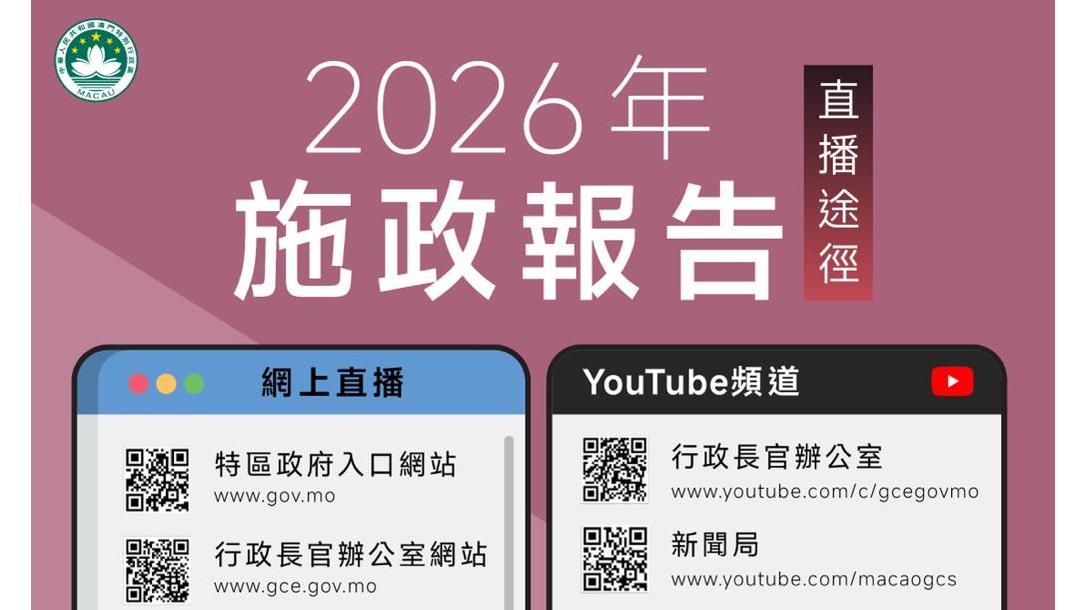 此外,新聞局屆時也在Facebook葡文專頁(www.facebook.com/macaogcspt)及英文專頁(www.facebook.com/macaogcsen),發佈2026年施政報告的資訊。