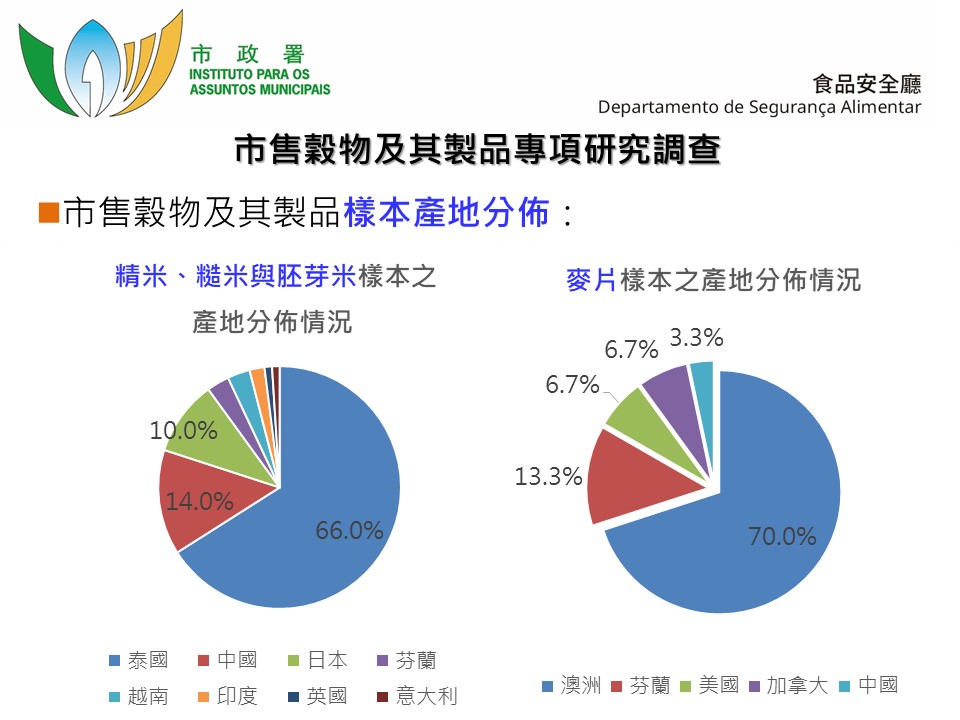 穀物及其製品為本澳市民經常食用的食品,穀物在種植過程中可能因吸收和累積各種重金屬或受外界環境以及貯存不當而遭真菌毒素污染。故市政署開展穀物及其製品專項食品調查,於本澳超級市場等零售場所抽取一百三十個樣本,食品類別包括精米、糙米、胚芽米和麥片,檢測項目包括重金屬無機砷、鎘和鉛,以及真菌毒素黃曲霉毒素B1和赭曲霉毒素A;檢測結果顯示,檢測樣本之重金屬以及真菌毒素檢出量均符合本澳相關食品安全行政法規之相關要求,全部樣本通過檢測,整體合格率為百分之百,顯示本澳穀物及其製品普遍符合本澳相關食安標準。