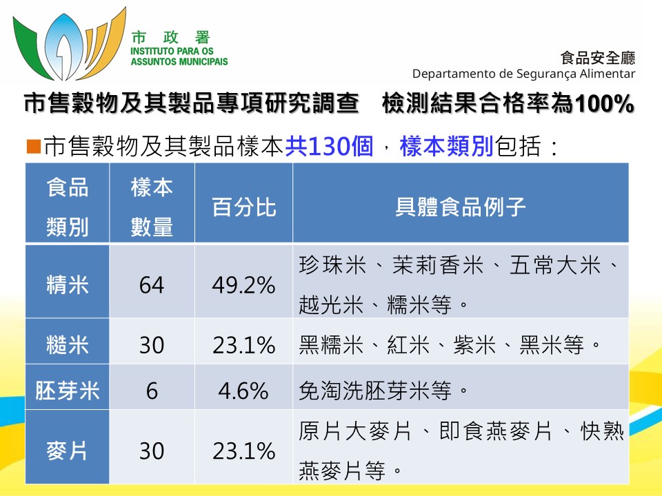 為瞭解本澳市售穀物及其製品的食用安全情況,市政署於市面抽取共一百三十個穀物及其製品樣本,包括精米、糙米、胚芽米和麥片進行重金屬及真菌毒素檢測,全部樣本通過檢測,均符合本澳食安標準。