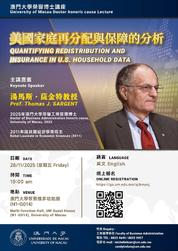澳門大學將於11月28日(星期五)舉行“澳門大學榮譽博士講座”,由澳大榮譽工商管理博士、2011年諾貝爾經濟學獎得主湯瑪斯‧薩金特(Thomas J. Sargent)以“美國家庭再分配與保障的分析”為題發表演說。歡迎有興趣人士報名參加。